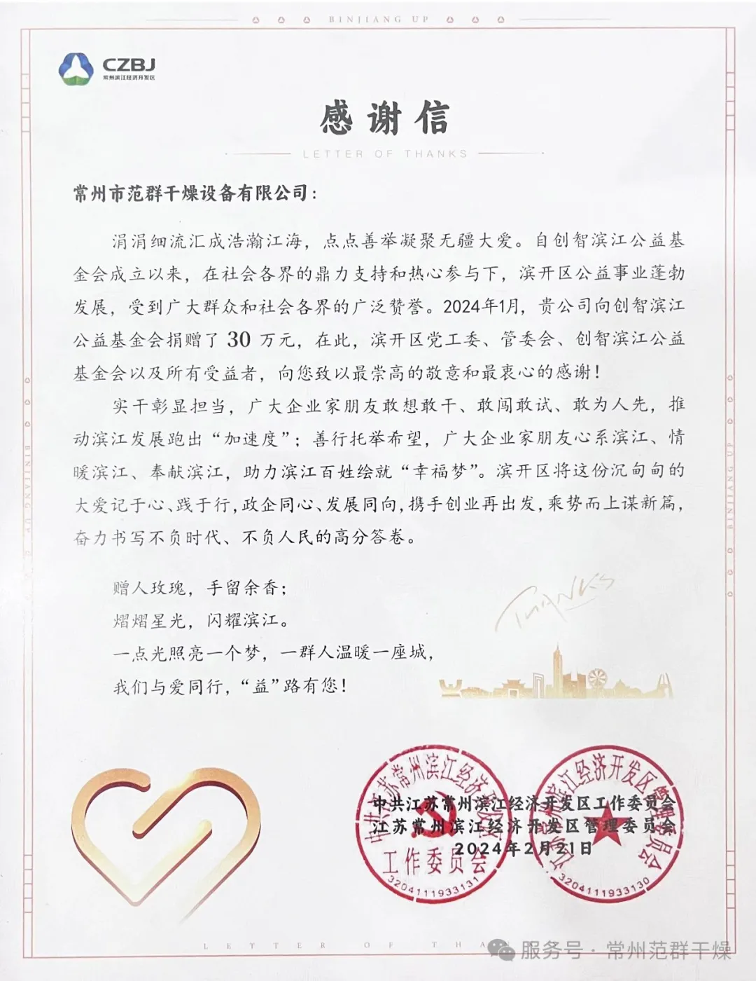 濱開(kāi)區(qū)黨工委、管委會(huì)及創(chuàng)智濱江公益基金會(huì)對(duì)常州范群的善舉給予高度肯定,認(rèn)為此舉不僅彰顯了企業(yè)的社會(huì)擔(dān)當(dāng),更凝聚了政企同心、共促發(fā)展的合力。未來(lái),常州范群將繼續(xù)立足主業(yè)、深耕發(fā)展,同時(shí)持續(xù)關(guān)注并參與公益事業(yè),與社會(huì)各界一道,為推動(dòng)區(qū)域高質(zhì)量發(fā)展、增進(jìn)民生福祉貢獻(xiàn)更多力量。