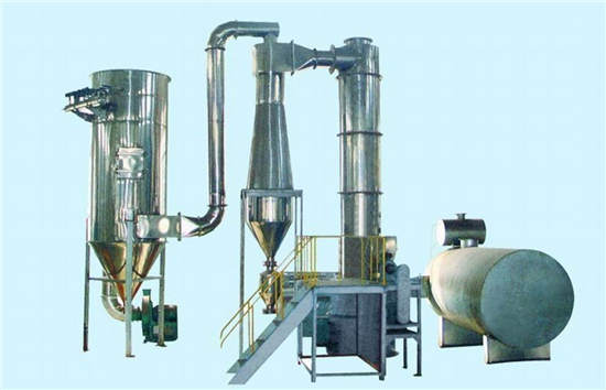 旋轉閃蒸干燥機采用高速熱氣流切線方向進入筒體,由于氣流在筒內的螺旋運動,一方面降低顆粒周圍的介質溫度,同時增加了介質流速和溫度,這就大大地提高了外擴散的速度。另一方面,高溫氣流高速沖擊于筒體下部的顆粒或濕料,同時筒體內攪拌葉片的攪拌作用,使顆粒被破碎、粒度減小、內部毛細管的長度也因之減小,強化了內擴散的效果,降低內擴散的阻力。這些顆粒又大多在筒體下部高溫、高攪拌強度的循環中被反復破碎。消除物料結塊,也是促進內擴散的有力措施,強化了顆粒水分的蒸發。